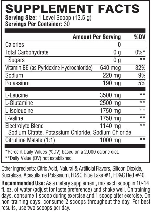 As a dietary supplement, mix one scoop per 8-10 oz. of water. Shake well and consume during exercise on training days or throughout the day on non-training days.