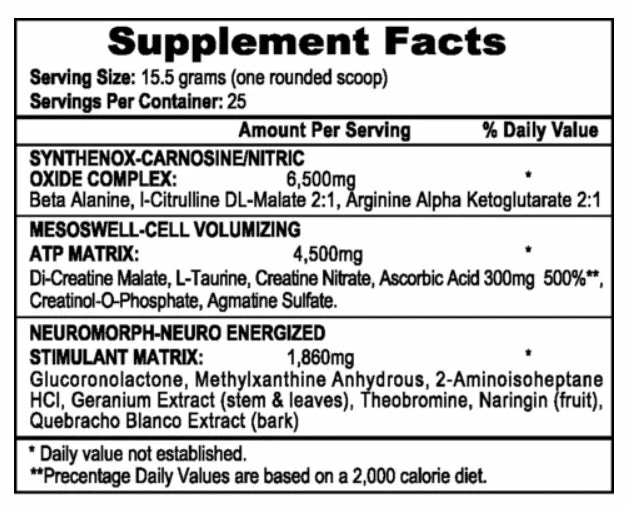Ingredients like Creatine Nitrate, Creatinol-O-Phosphate, 4,000mg of Beta Alanine, and Citrulline Malate really makes Mesomorphs pumps stand out more than any other. The clinically backed water solubility of Creatine Nitrate will improve absorption and none of the side effects of creatine supplementation.