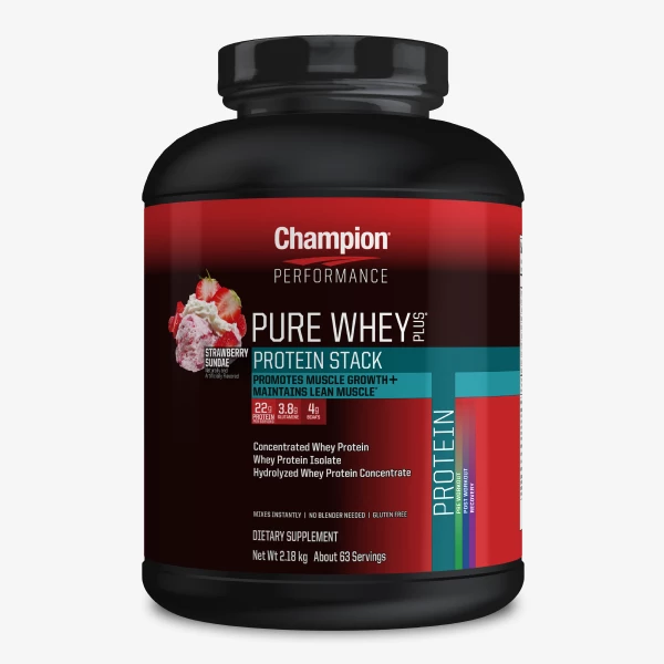 If you’re looking for a delicious way to help fuel your workout routine, try Champion Performance Pure Whey Plus in chocolate, strawberry, or cookies and cream flavor.