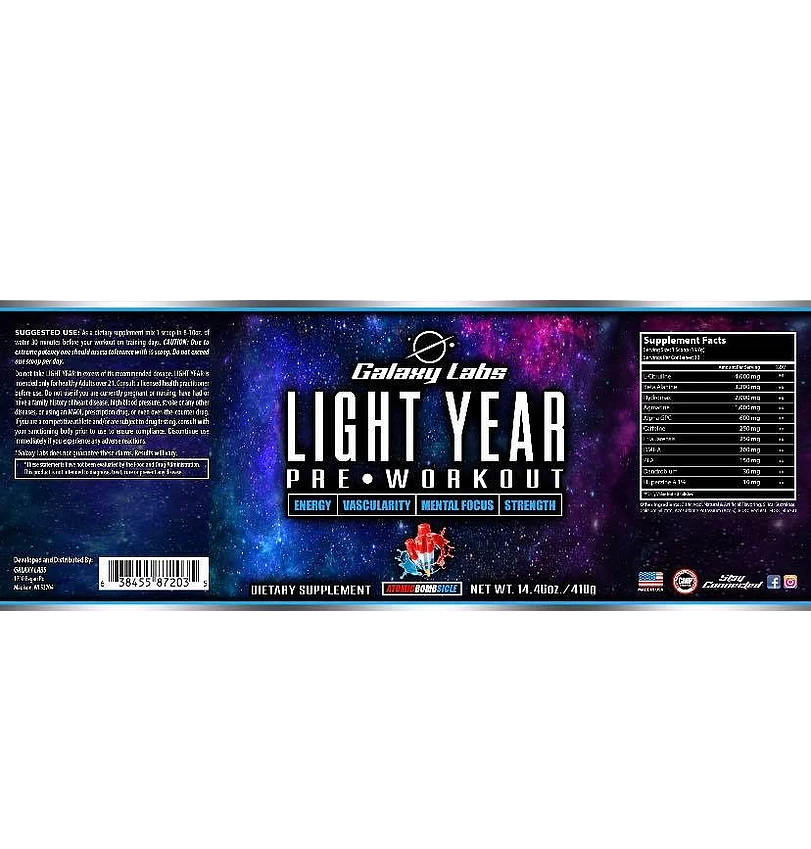 Designed to hit as hard as an atomic blast, Light Year is loaded with ingredients such as DMHA and Caffeine for razor sharp, intense focus and drive. It also has a loaded profile of 4g Citrulline, 2g HydroMax and 1g Agmatine for maximizing blood flow and pumps, delivering the skin-tearing fullness and vascularity you crave.