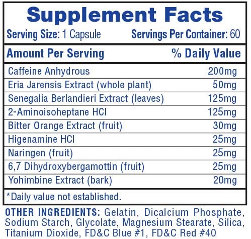 jarensis for intense energy and focus, bitter orange and yohimbe bark for enhanced
