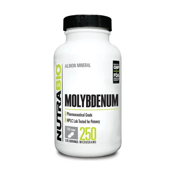 Molybdenum aids in the metabolism of fats and carbohydrates and is an essential cofactor of enzymes. NutraBio Molybdenum is sourced from Albion Minerals and has better absorption and digestibility than other forms of Molybdenum. NutraBio Molybdenum provides 333% of your daily needs.