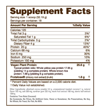 - 20g Premium Plant Protein/serving from Yellow Peas and Brown Rice