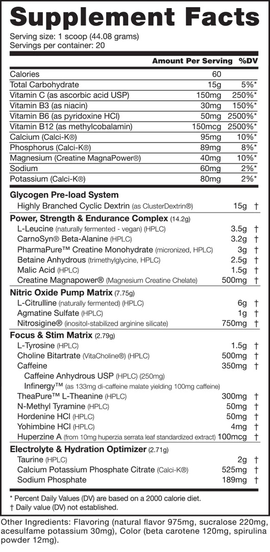 As a dietary supplement, mix 1 heaping scoop of PRE into 12-14 ounces of water and consume 30-45 minutes prior to resistance training. Vary the amount of water to achieve your desired flavor level. PRE is extremely powerful, first time users should begin use with 1/2 scoop or less to assess your tolerance. DO NOT EXCEED 1 SCOOP IN ANY 24 HOUR PERIOD OR USE MORE THAN 5 DAYS IN ANY 7 DAY PERIOD.