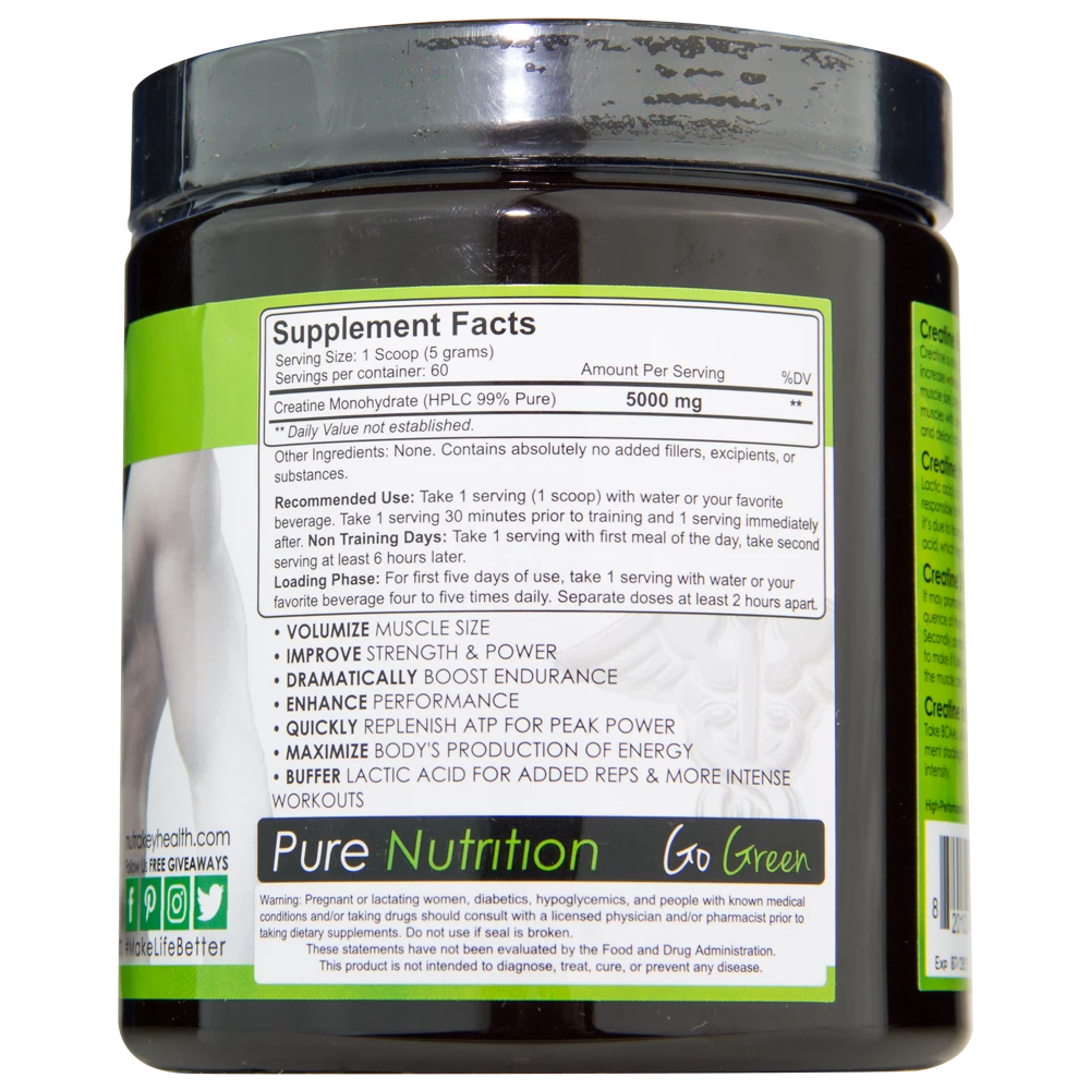 Pharmaceutical grade HPLC certified 100% pure! Micronized for maximum bio-availability. What is Creatine? Creatine is naturally produced in the human body from amino acids primarily in the kidney and liver. Approximately 95% of the human body’s total creatine is located in skeletal muscle. Creatine is manufactured from amino acids L-arginine, glycine, and L-methionine Benefit Of Using Creatine Monohydrate โขVolumize Muscle Size โขEnhance Strength & Power โขDramatically Boost Endurance โข& Improve Athletic Performance โขQuickly replenish ATP โขMaximize Energy Production โขBuffers Lactic Acid for More Intense Workouts โขNo Cramping or Upset Stomach. How Does Creatine Work? Creatine bonds with Phosphorus in the body making Creatine Phosphate (CP) which is a high energy compound used by muscles for instant energy needs. CP breaks down directly into Adenosine Tri-Phosphate (ATP, heat energy) the body’s primary source of energy. Any fast powerful movements such as weight lifting or sprinting, for example, are fueled by CP. Skeletal muscle holds CP in high amounts depending on the level of conditioning. Muscles that perform high energy movements frequently will have, and require much larger concentrations of Creatine, free form aminos, and proteins. Holding more creatine means your body will physically be able to perform more work. Boosts Muscle Strength, Strength and Endurance Creatine is one of the most researched and important sports supplements today. It has become a must for athletes wanting to increase workout intensity while delaying the onset of fatigue. Research has shown that supplementing with creatine can boost muscle size, strength and endurance, improve athletic performance, and speed muscle recovery. Saturating your muscles with creatine improves your body’s ability to quickly replenish and recycle ATP, which increases muscle energy and delays muscle fatigue. Studies show that when athletes supplement with creatine while weight training, they can quickly gain lean body mass and strength. Creatine Improves Exercise Recovery Time Lactic acid is a bi-product from anaerobic (without oxygen) exercise, such as weight training. Lactic acid is responsible for the ‘burning’ sensation when the muscle becomes fatigued. When you cannot train anymore, it is due to you either having run out of energy or a buildup of lactic acid. Creatine may act as a buffer for this lactic acid, which helps to delay the onset of fatigue.