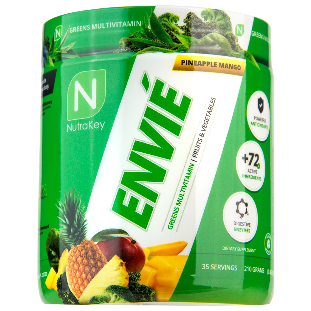 Complete Multi-Vitamin. Higher Energy Levels. Well Being. Organic. GMP, NSF, ISO 9001:2000 Certified. Naturally Sweetened Sugar-Free. Vitamins, Minerals, Greens, Antioxidants, Aminos, Digestive Enzymes. Envie is a high potency multi-vitamin formula fortified with greens, antioxidants, amino acids, vitamins, minerals, and immune boosting nutrients. Our quick-dissolving powder is designed for superior absorption and maximum effectiveness in filling nutritional gaps. Feel rejuvenated with more energy. Experience strengthened immune system, improved everyday feeling of well-being and a naturally supercharged metabolism. Put Envie to the test and feel the difference for yourself. Why a powder vs. pills or liquid? The logical reason to choose a powder vitamin over the traditional pill from vitamin is absorption. As compared to pills, which according to the Physician’s Desk Reference have a very poor absorption rate approximately 10-15%, Envie powder vitamin has a 99% absorption rate. As far as liquid vitamins go, it is a fact that vitamins, minerals as well as many other nutrients are quite sensitive to their physical environment. The stability of many vitamins and minerals is extremely poor when suspended in liquid. As a consequence, the consumer may not receive the proper amount of specific ingredients listed on the bottle when ingested. Envie powdered vitamin is the quickest way into the bloodstream because it is able to bypass the digestion process and avoid the natural breakdown which leads to loss of potency. Remember, it’s not how much you take, but rather how much you absorb. Increase Natural Energy & Vitality. Enhance Strength & Endurance. Bolster Your Immune System. Recovery from Daily Stress and Exercise. Great Source of Fruits and Vegetables.