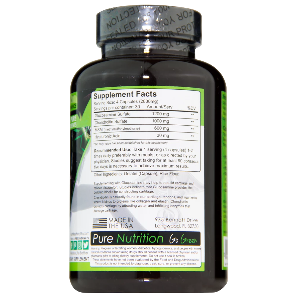 Healthy joints & cartilage. Powerful joint lubricant. Improve joint comfort & flexibility. Fast absorbing, high-potency joint complex designed to be a high-potency joint complex capable of supporting healthy joints function. Whether you swim, run, occasionally lift weights, bodybuild, or do yoga, the ingredients in this comprehensive joint formula can strengthen joint tissues and improve flexibility. Collagen production decreases significantly with age and is the source of a number of serious degenerative diseases. Research shows healthy collagen production can be sustained through supplementing and healthy diet habits. Provides critical nutrients to stimulate cells and help build joint cartilage. Promotes lubrication for joint comfort. Stimulates the synthesis of hyaluronic acid, important for tissue growth, regeneration & healing. MSM is easily absorbed and is one of the major building blocks of glycosaminoglycans; which are key structural components in cartilage that play an important role in the maintenance of healthy joints. Supplementing with Glucosamine may help rebuild cartilage and treat arthritis. Studies indicate that Glucosamine provides the building blocks for constructing cartilage. Chondroitin is naturally found in our cartilage, tendons, and ligaments where it binds to proteins like collagen and elastin. Chondroitin protects cartilage by attracting water and nutrients and by inhibiting cartilage-damaging enzymes.