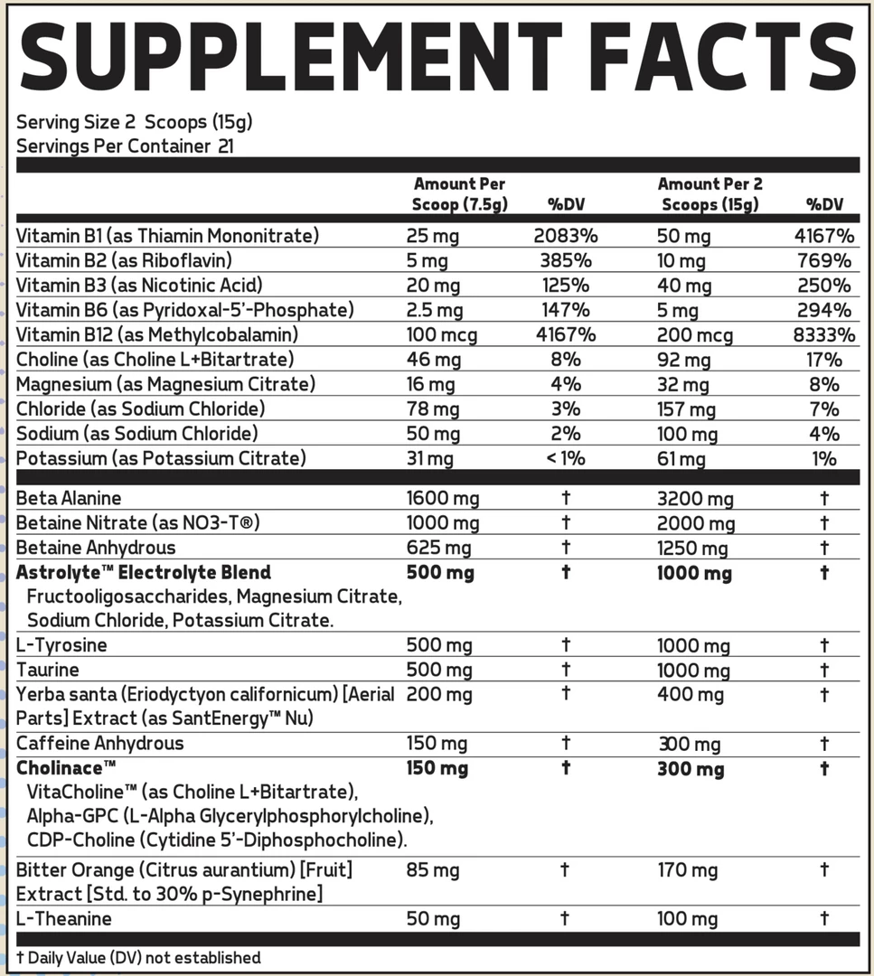 - 400mg Caffeine + 300mg Cholinace + 250mg Tyrosine for Intense Energy & Focus