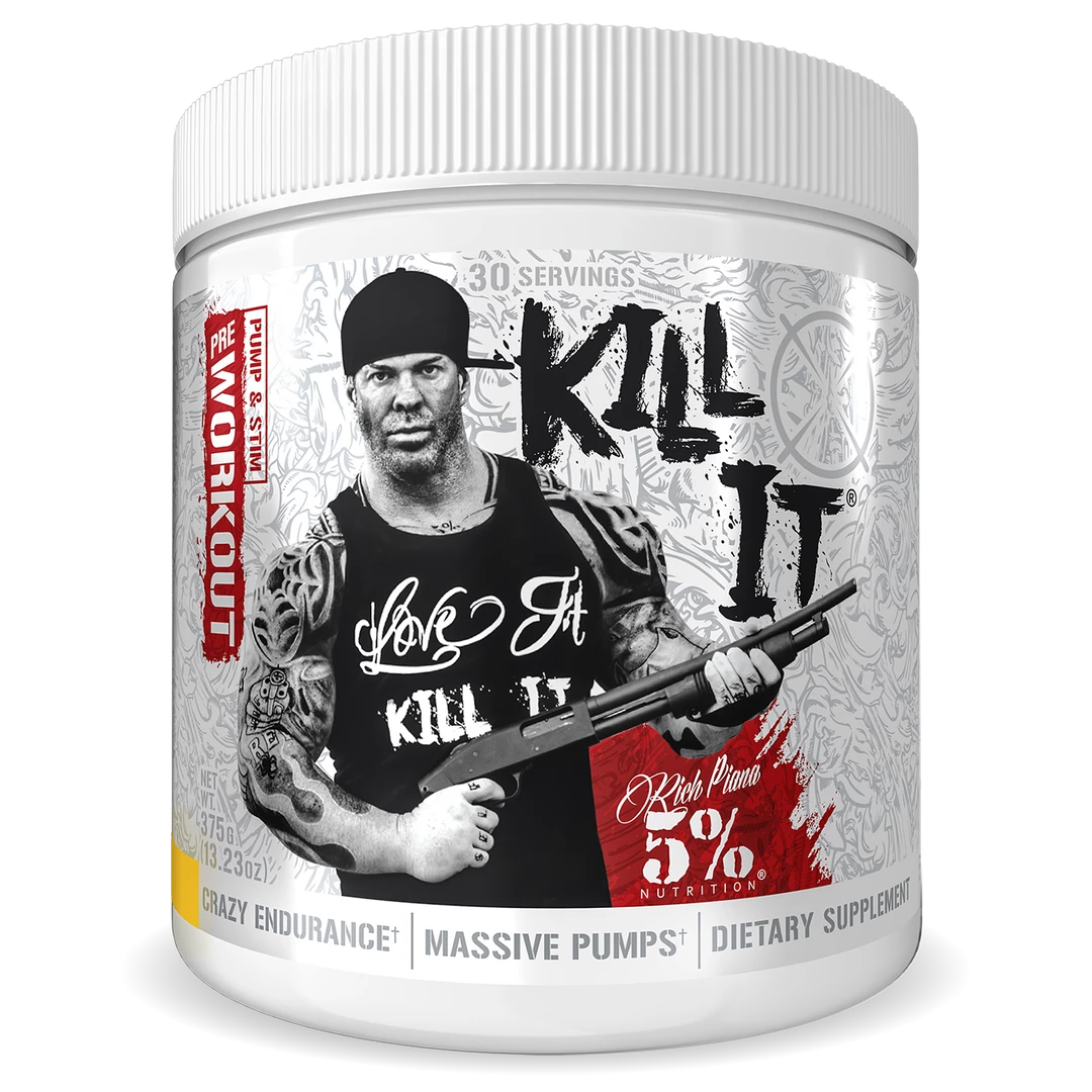 Rich Piana Kill It Pre-workout was designed to elevate your ability to train harder, stay strong longer, and produce a overflowing pipeline of muscle healing blood to your working muscles. Like any 5%er, you love working out and having killer workouts; all you need is something to help you get past your natural ability. To be the best, and train like the best, you donโt just need a good workout- you need to Kill It!