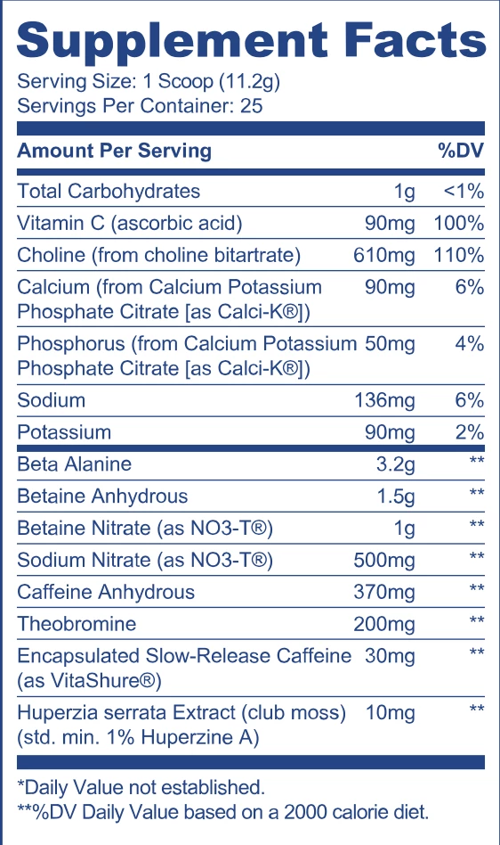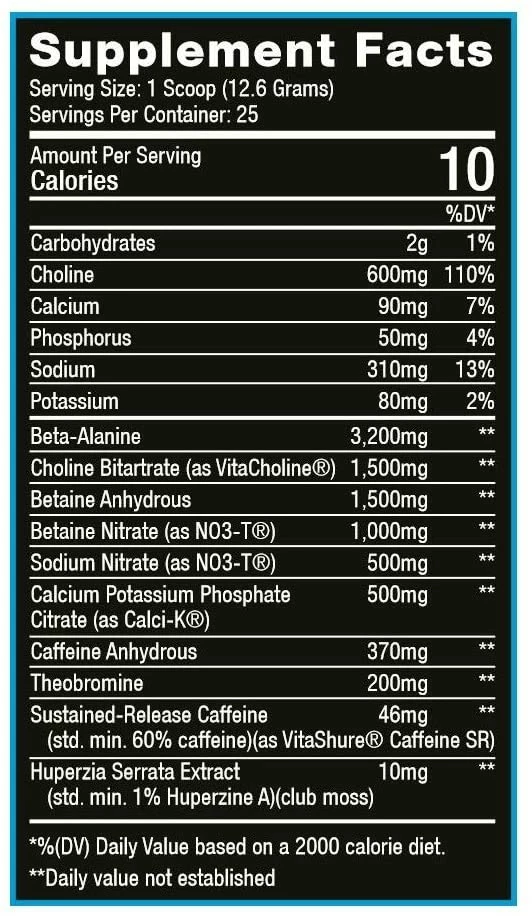 - 3.2g Beta Alanine + 1.5g Betaine Anhydrous or Enhanced Training Capacity & Performance